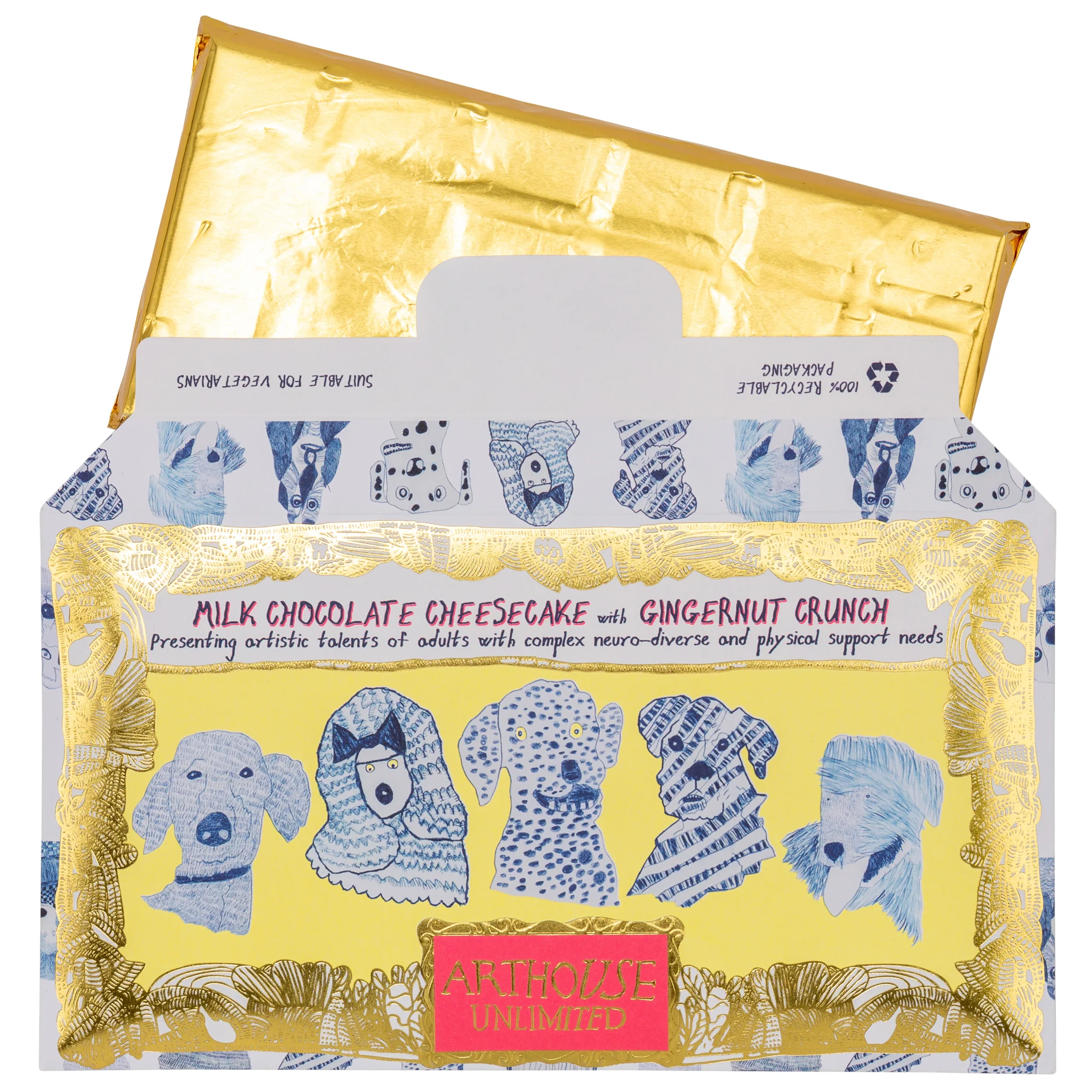 A dog lovers delight, this mouth-watering milk chocolate cheesecake with gingernut crunch chocolate bar is made in the UK with responsibly sourced single origin cocoa. Wrapped in coloured foil & encased in a recyclable envelope, this bar features the ARTHOUSE Unlimited artists' original Blue Dogs artwork shimmering in a dazzling gold frame. An ideal gift for dog fans, art lovers & good-cause supporters everywhere!