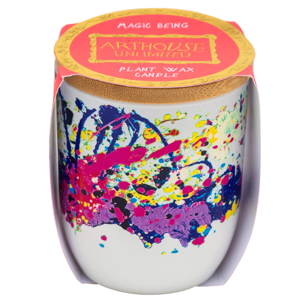 A uniquely fragranced vegan-friendly candle featuring the beautiful ‘Magic Being’ artwork created by talented ARTHOUSE Unlimited artist David Bell on white glass.